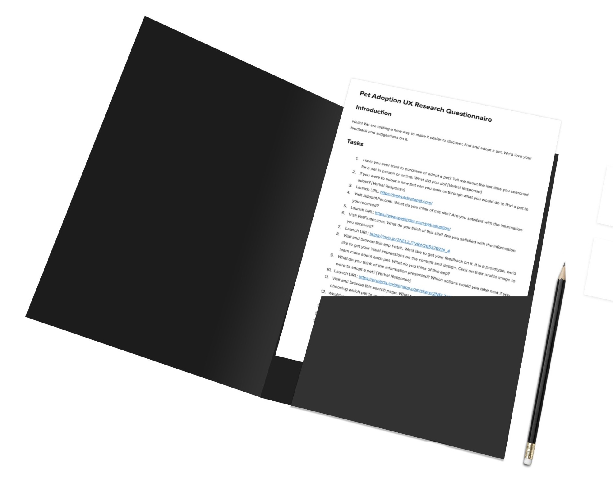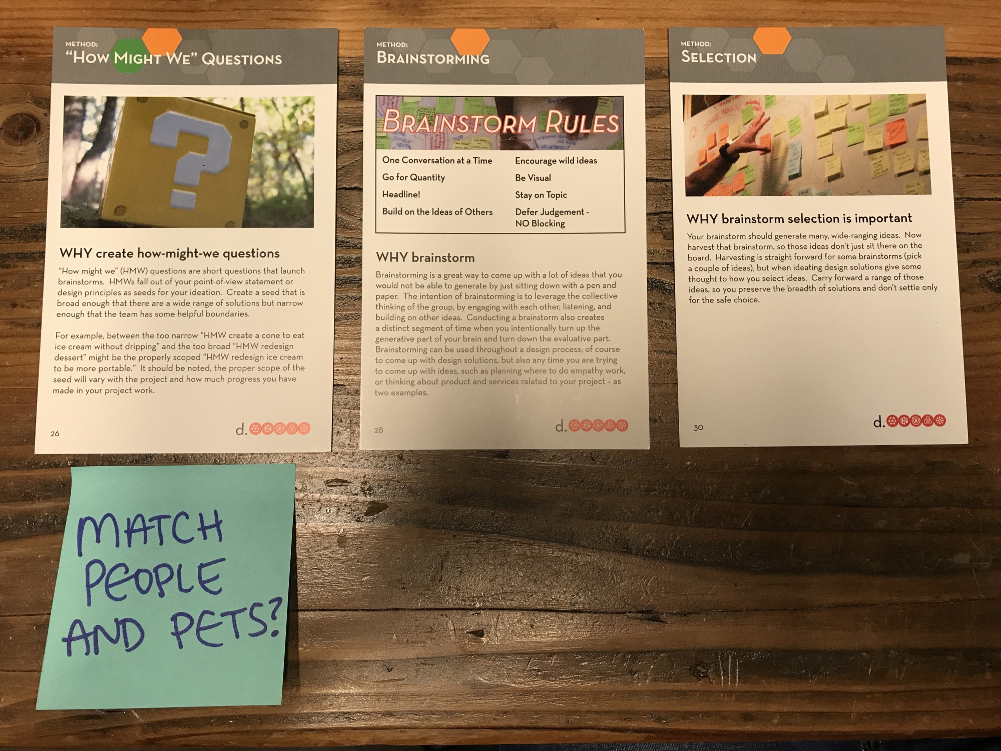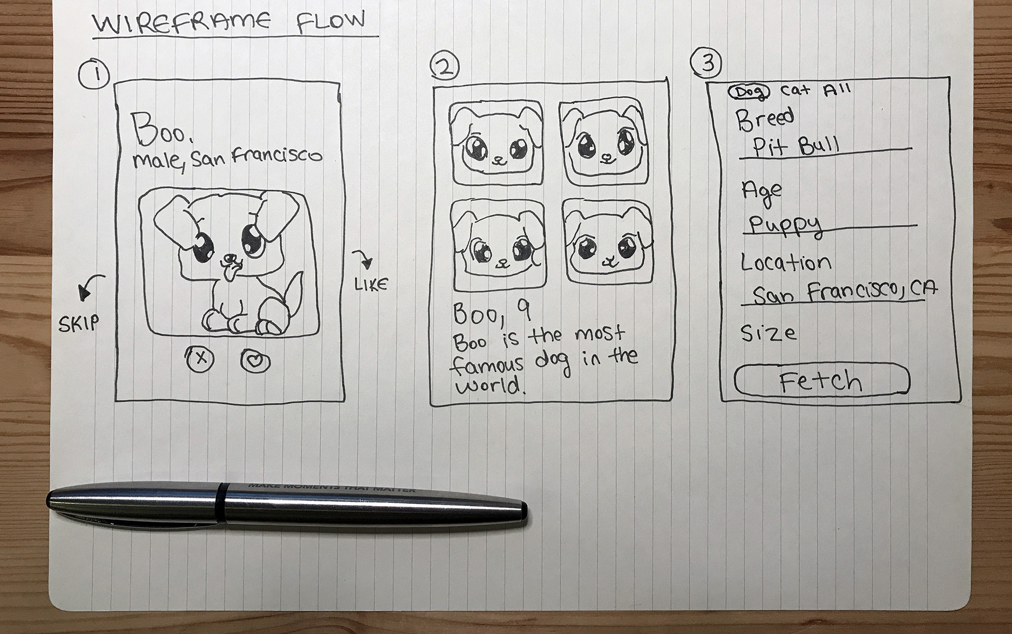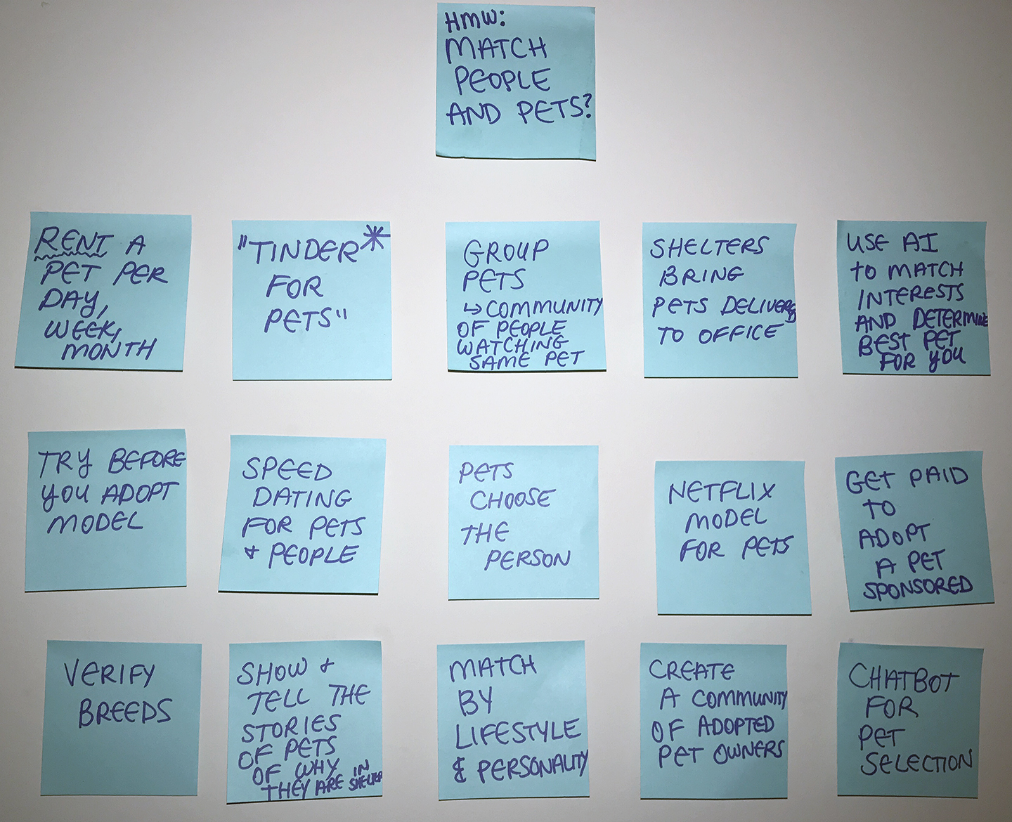 Exercise: Design an experience that will help connect people looking for a new pet with the right companion for them. Help an adopter find a pet which matches their lifestyle, considering factors including breed, gender, age, temperament and health status.